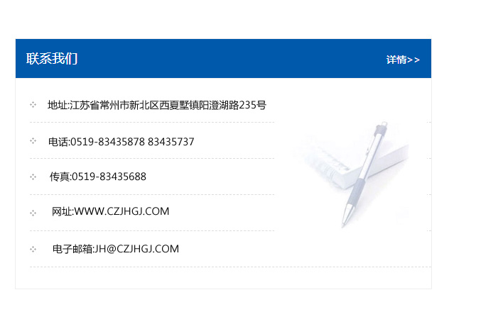 地址:常州市新北區友邦商務大廈1幢16、17層  電話:0519-85101652  傳真:0519-85112595  郵編:213022  網址:www.cz-jiayue_cn.0792rzjy.com  郵箱:xiajifengaa@163.com